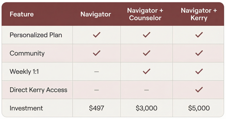 - Coaching with Kerry ($5,000) — Direct weekly oversight with Kerry for complex cases, advanced interpretation, and higher-level strategic adjustments.